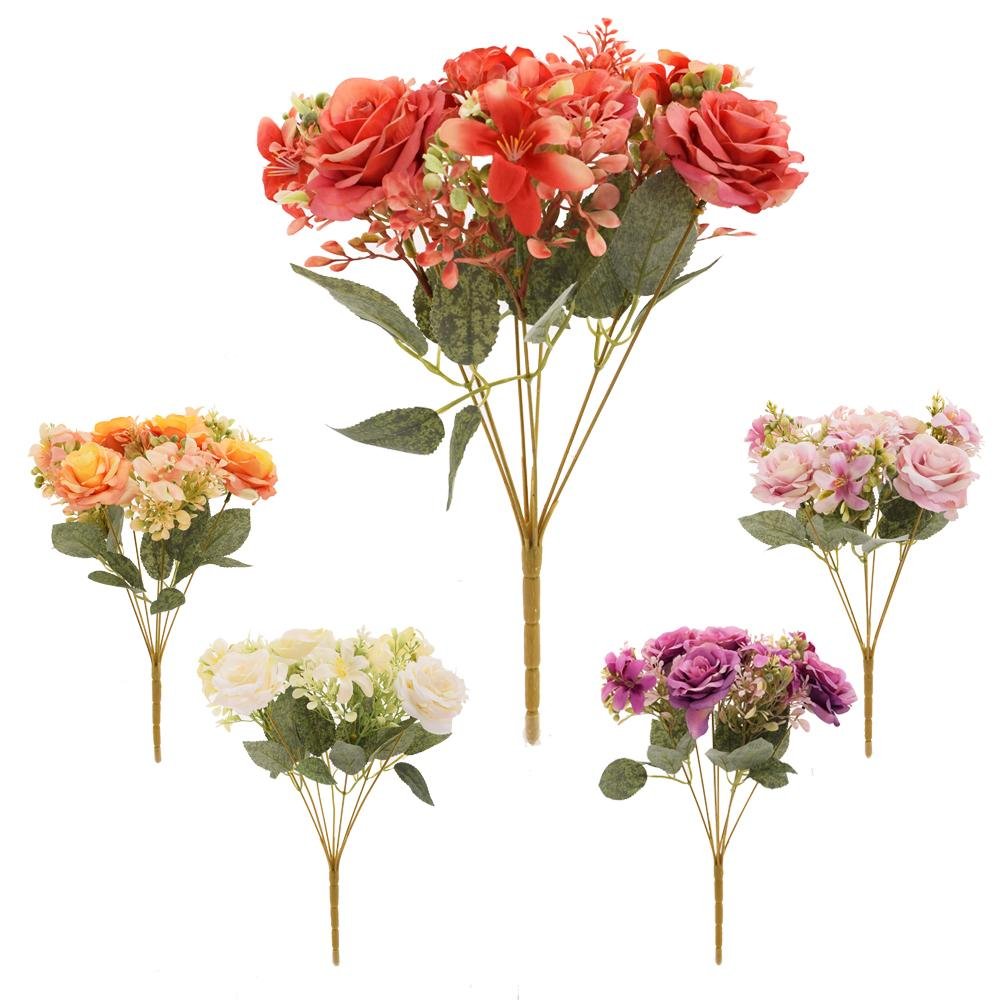 Dekorácia Kytica ruža, drob.kvety, zeleň mix/5f 35cm