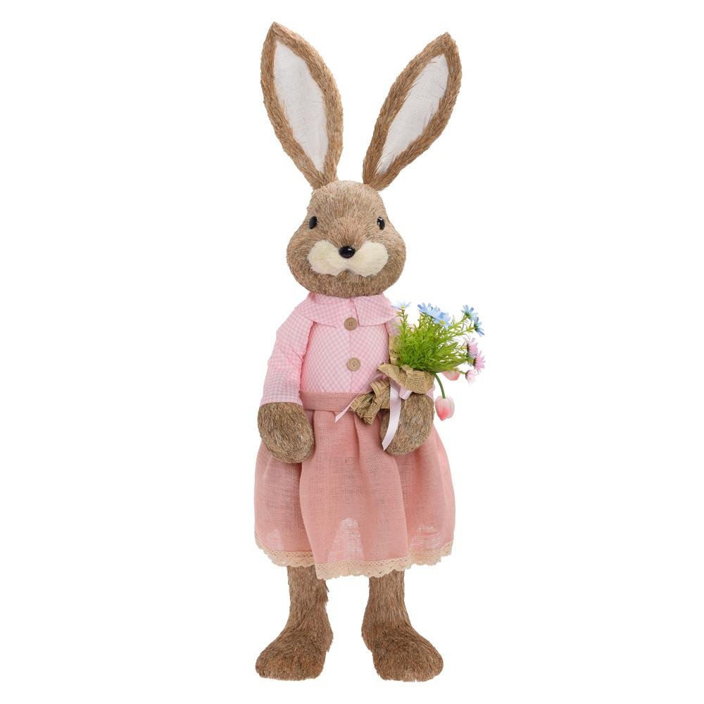 Dekorácia Zajačica s kyticou hne/ruž slama 40*34*120cm