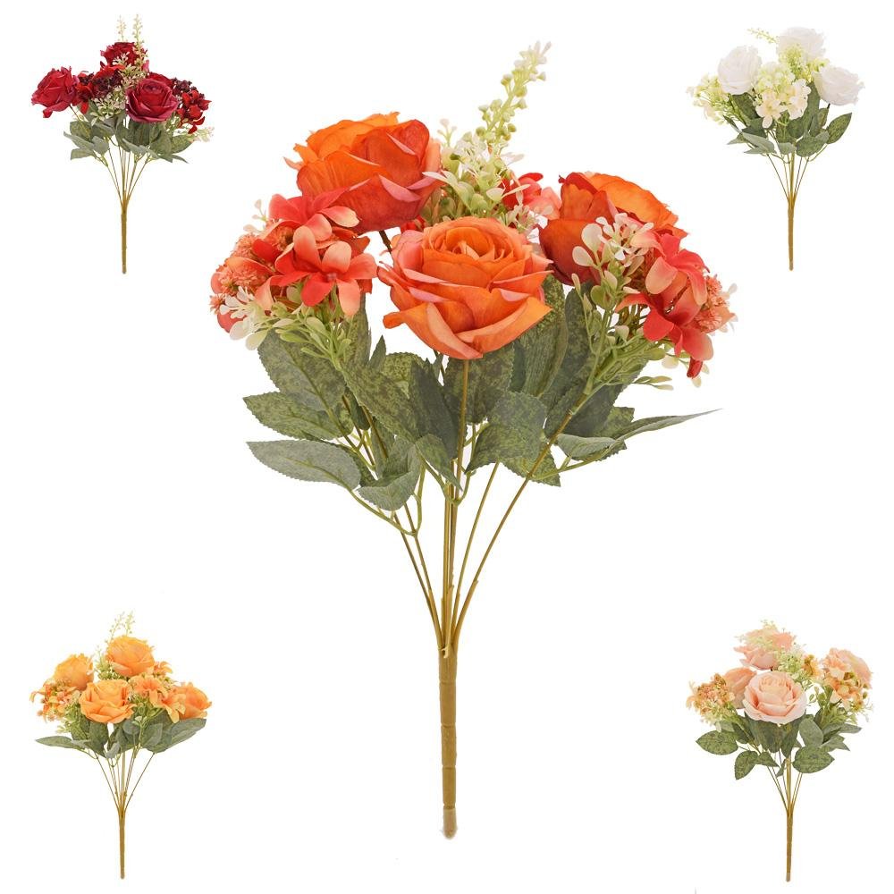 Dekorácia Kytica ruža, drob. kvety, zeleň mix/5f 45cm