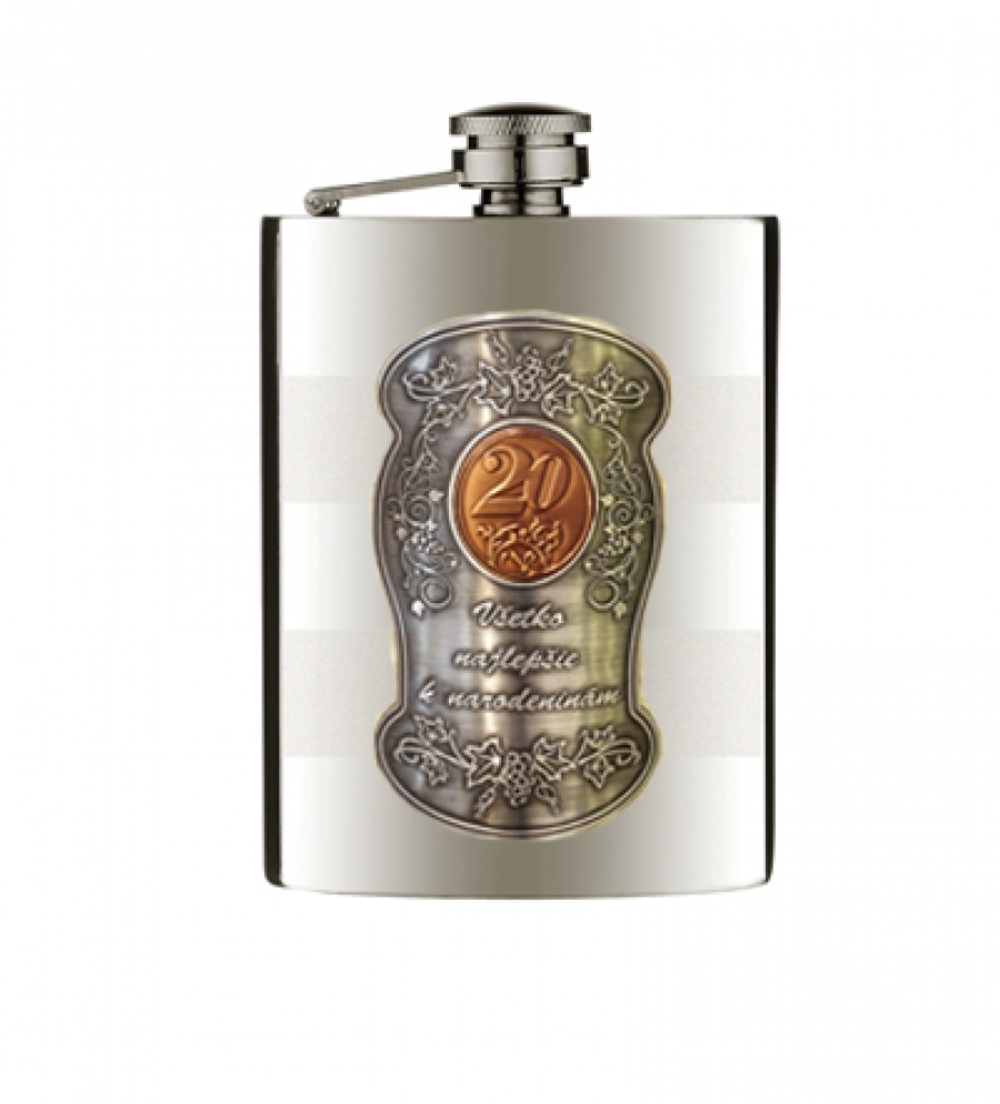 Ploskačka nerez oceľ, kovová pečať s venovaním Všetko najlepšie k narodeninám s vekom. Objem 200 ml. Balenie retail.