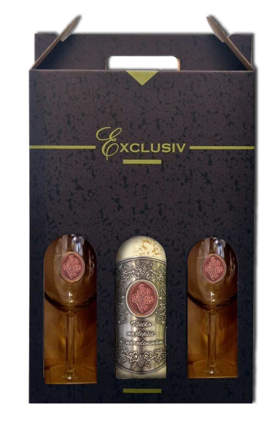 Darčekový set obsahuje Gold Cuvee 23 karátové zlaté lupene - víno s 23 karátovým zlatom s kovovou etiketou s venovaním všetko najlepšie k narodeninám bez veku oslávenca + 2 ks pohár na víno s brondzovou pečaťou, darčekové balenie exlusive.Možnosť objednať ružové Svätovavrinecké, alebo červené Frankovka modrá.Obsah alkoholu 11,5% objemu. Svätovavrinecké 11,5% objemu, Frankovka modrá 12% objemu.