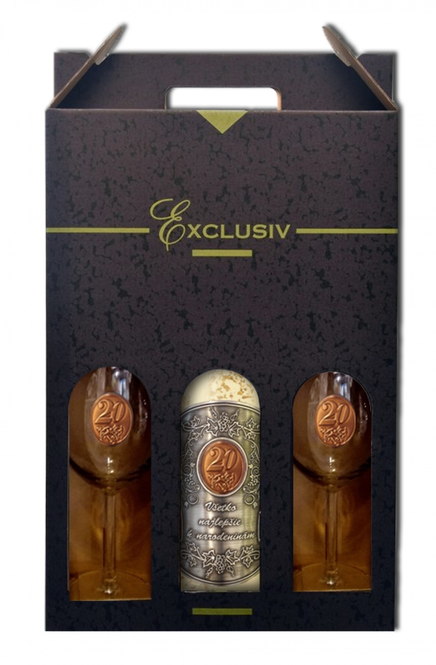 Darčekový set obsahuje Gold Cuvee 23 karátové zlaté lupene - víno s 23 karátovým zlatom s kovovou etiketou s venovaním všetko najlepšie k narodeninám s vekom 20 rokov + 2 ks pohár na víno s brondzovou pečaťou, darčekové balenie exlusive.Možnosť objednať ružové Svätovavrinecké, alebo červené Frankovka modrá.Obsah alkoholu 11,5% objemu. Svätovavrinecké 11,5% objemu, Frankovka modrá 12% objemu.