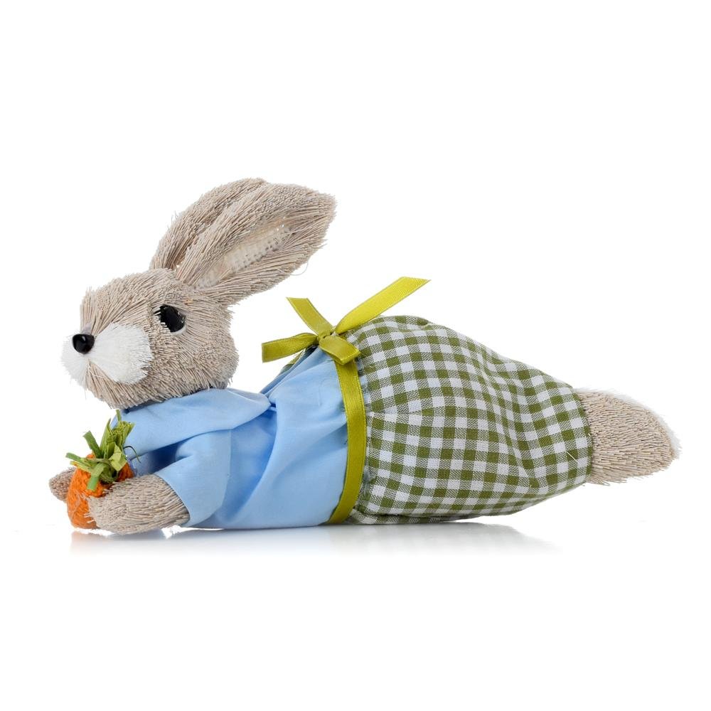 Dekorácia Zajac ležiaci mod/zel obleč., mrkvička, priadza 12*19*12cm