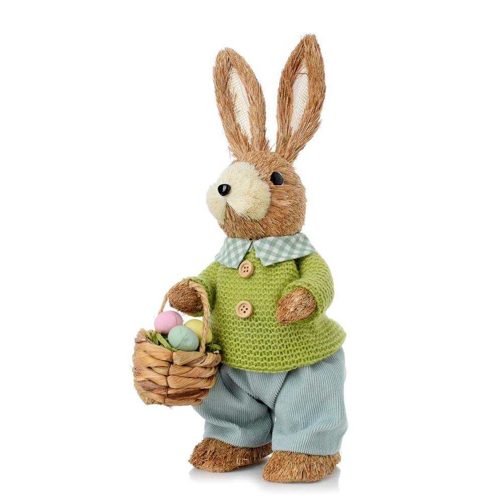 Dekorácia Zajac zel košielka,mod nohavice s košíkom slama 14*13*33 cm