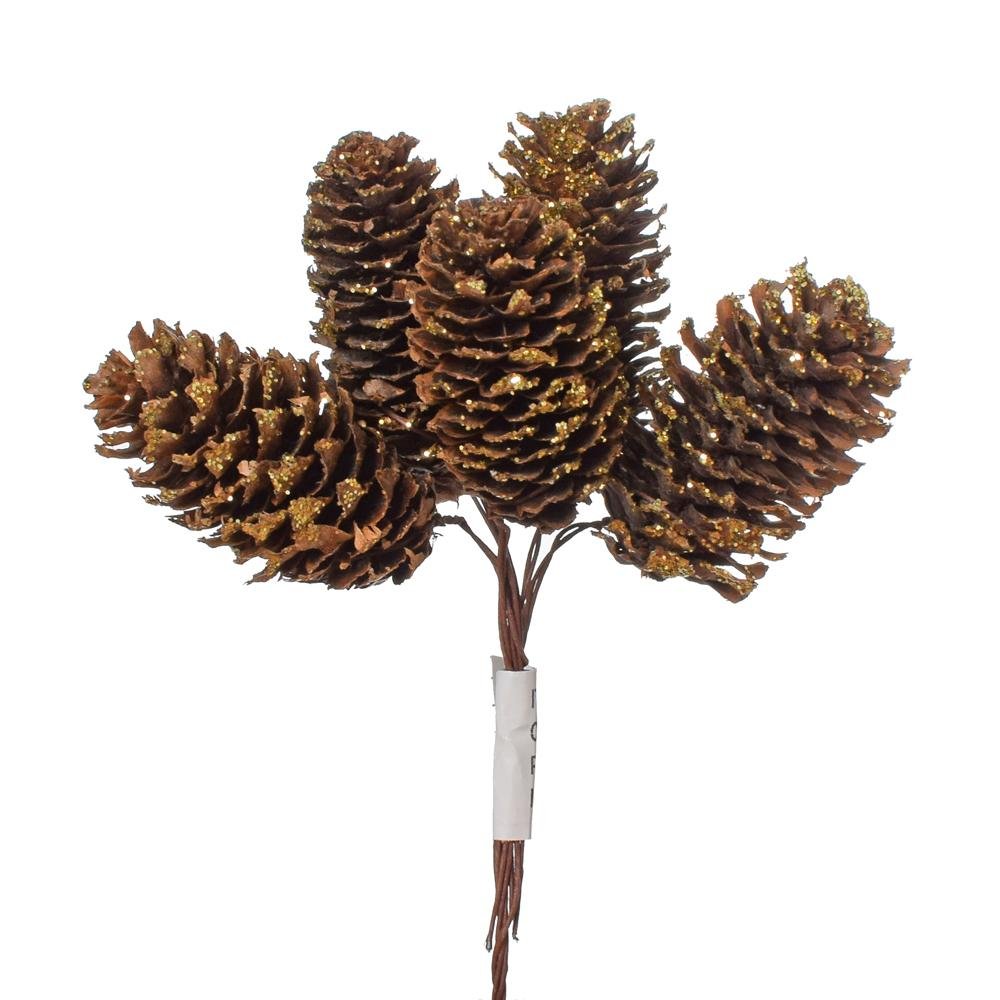 Dekorácia Zápich šišky hne/zlaté gliter /6 13cm