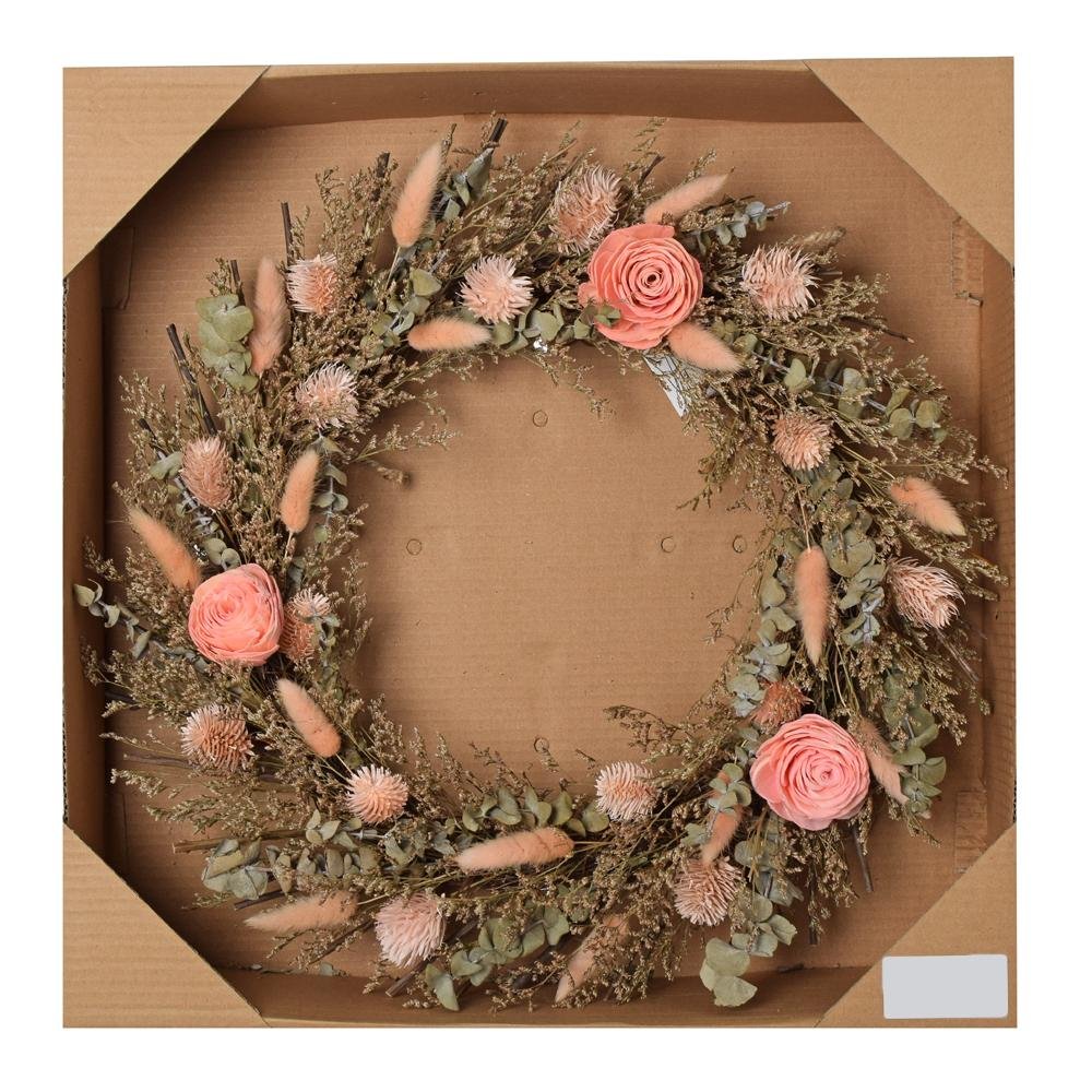Dekorácia Veniec suš.,ruže,bodl.,limo,lagur, bl.ruž/kr/siv.zel 46cm