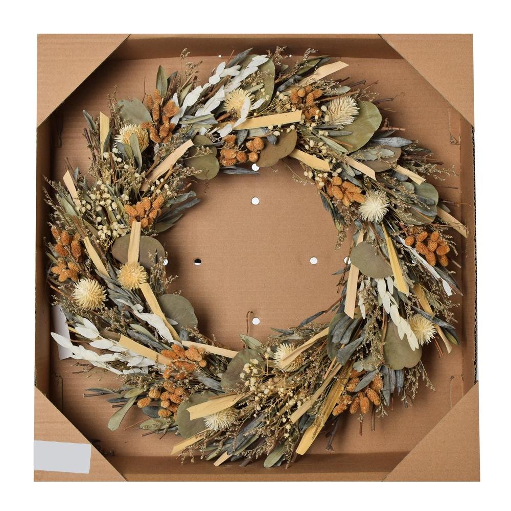 Dekorácia Veniec suš.,bodl, eucal,gyps, mix trávy,kré/hne/siv.zel 46cm