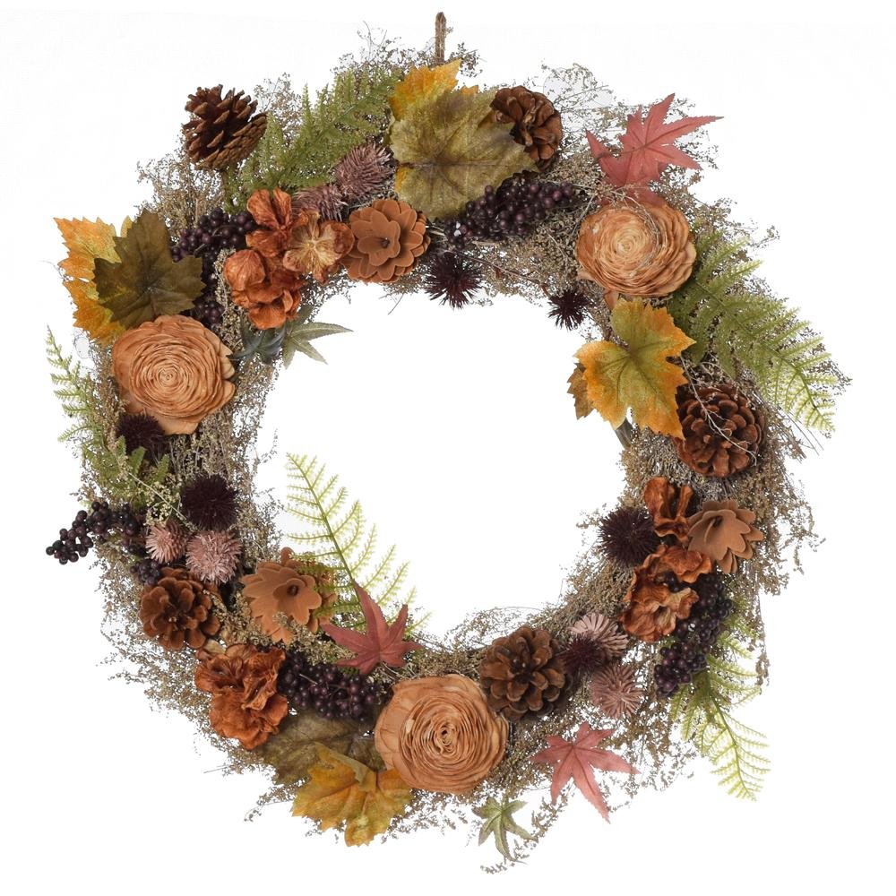 Dekorácia Veniec suš. ruže, šiš.,plod.,list, pap,trá.,hn-or/zel,fia 46cm