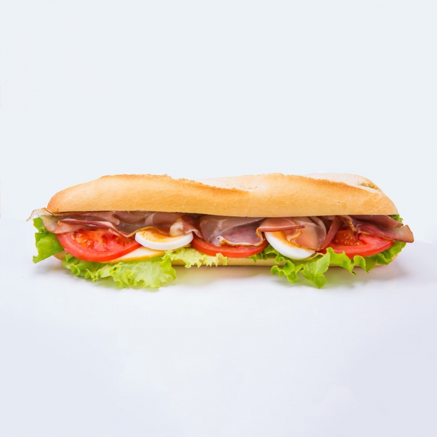 Zloženie: bageta majonéza šalát schwarladska šunka paradajka údený syr vajíčko Balenie: 1 ks voľné balenie Hmotnosť: 250 g Alergény: 1,3 Min. obj. 10 ks Obj. min. 24 hodín dopredu Zoznam alergénov - klikni TU
