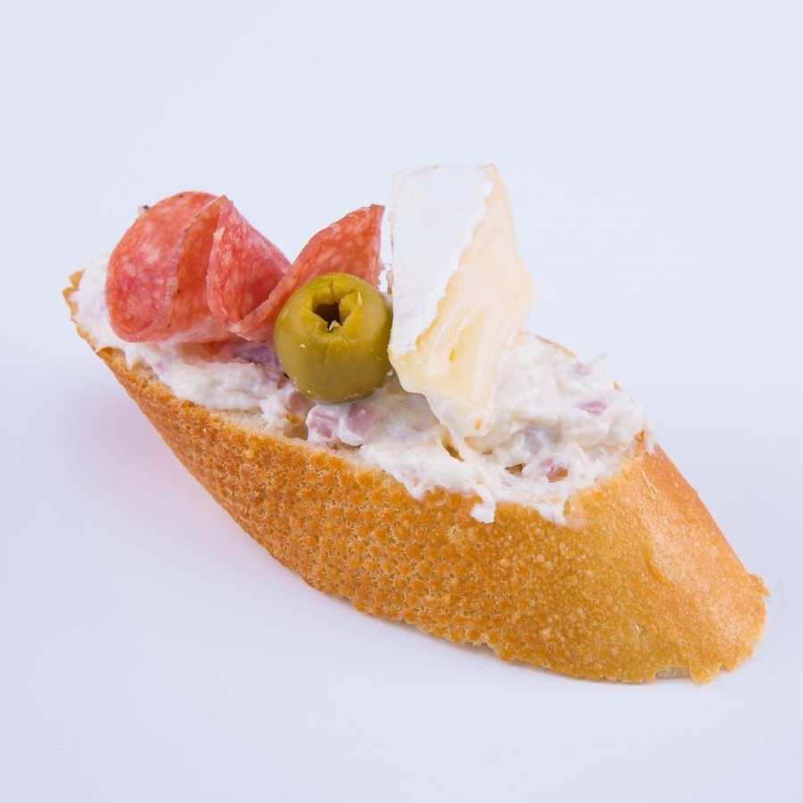 Zloženie: svetlá bagetka šunková pomazánka saláma camembert oliva Balenie: 1 ks voľné balenie Hmotnosť: 40 g Alergény: 1,3 Min. obj. 15 ks Obj. min. 24 hodín dopredu Zoznam alergénov - klikni TU