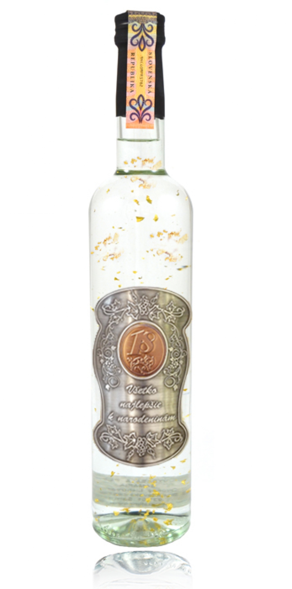 Vodka (borovička) so zlatom - Darčeková fľaša k narodeninám - kovová etiketa Hľadáte ideálny darček k narodeninám a neostáva vám už veľa času, aby ste prevrátili internet hore nohami? Naša vodka (borovička) so zlatom ako darčeková fľaša k narodeninám poteší naozaj každého a vo vašich rukách ju môžete mať doslova ihneď. V našej ponuke máme napríklad rôzne darčekové fľaše s kovovou etiketou, na ktoré si môžete nechať dokonca nalepiť aj konkrétny vek oslávenca od 0 do 90 rokov. Vďaka tomu, máte v rukáve naozaj originálnu darčekovú fľašu, ktorá sa hodí na každú príležitosť. Navyše, naša vodka (borovička) so zlatom v sebe ukrýva pravé a jedinečné lupene 23-karátového zlata, ktoré urobia z vašej darčekovej fľaše priam kráľovský dar. Kto by chcel pátrať ešte viac do hĺbky, tak vedzte, že naše darčekové fľaše pochádzajú z rodinnej pálenice v Šamoríne, ktorej tradícia siaha ešte do 80. rokov. Darčeková fľaša k narodeninám je pripravená vyhovieť skutočne všetkým vašim požiadavkám. Stačí si len vybrať tú svoju.