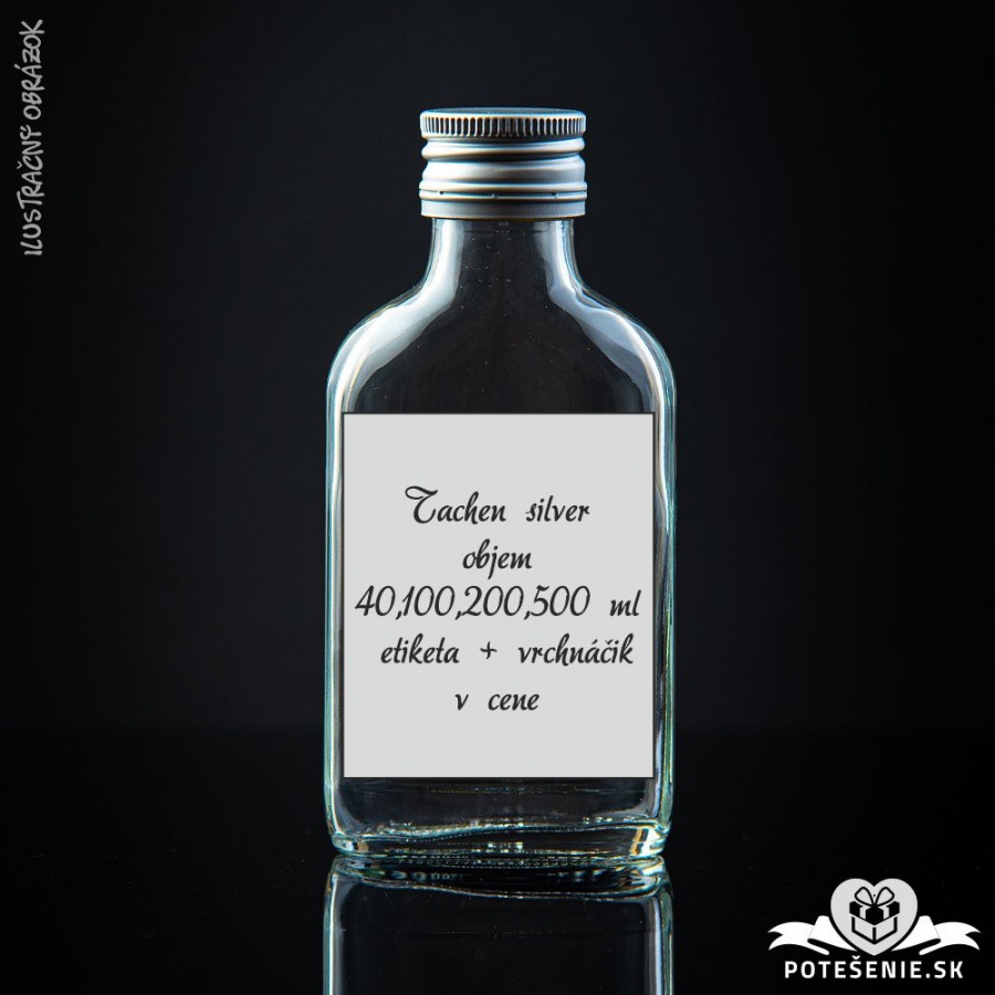 Prázdna svadobná fľaštička Taschen Silver so strieborným vrchnáčikom v objemoch 40, 100, 200, 500 ml. Etiketa zhotovená na mieru podľa vlastného návrhu.
