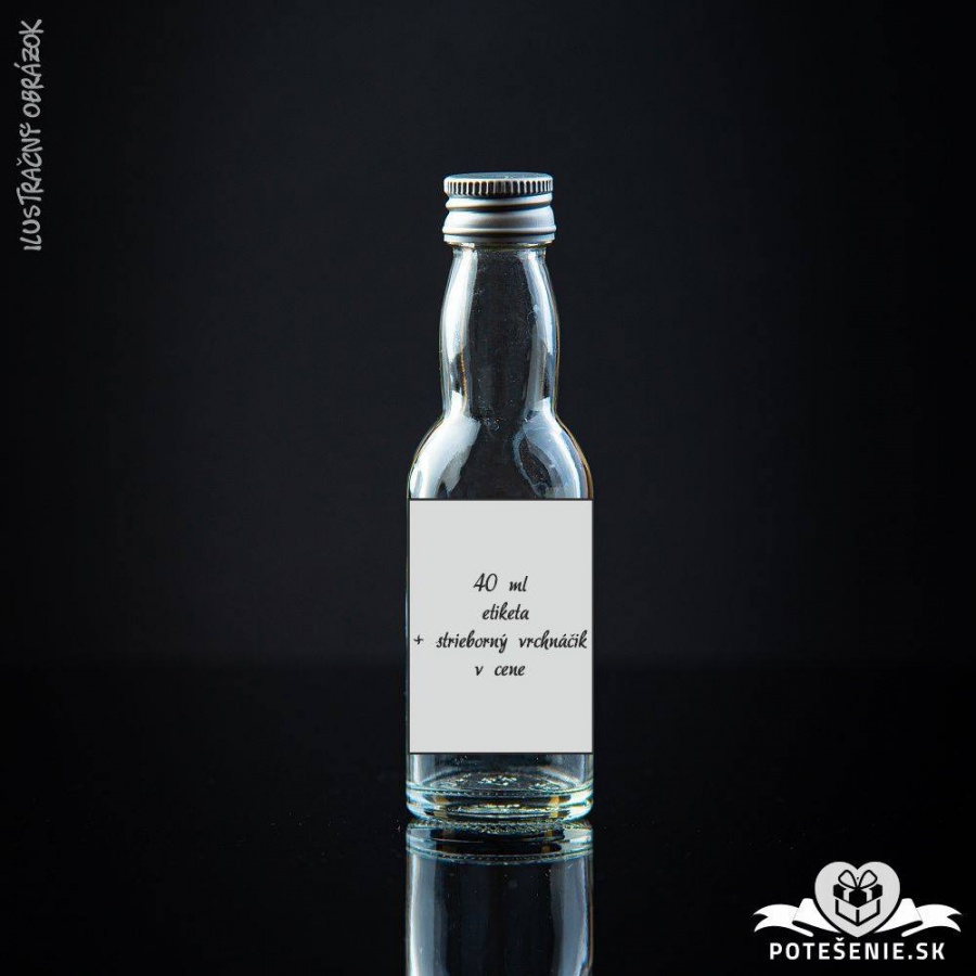 Prázdna svadobná mini fľaštička so strieborným vrchnáčikom v objeme 40 ml. Etiketa zhotovená na mieru podľa vlastného návrhu.