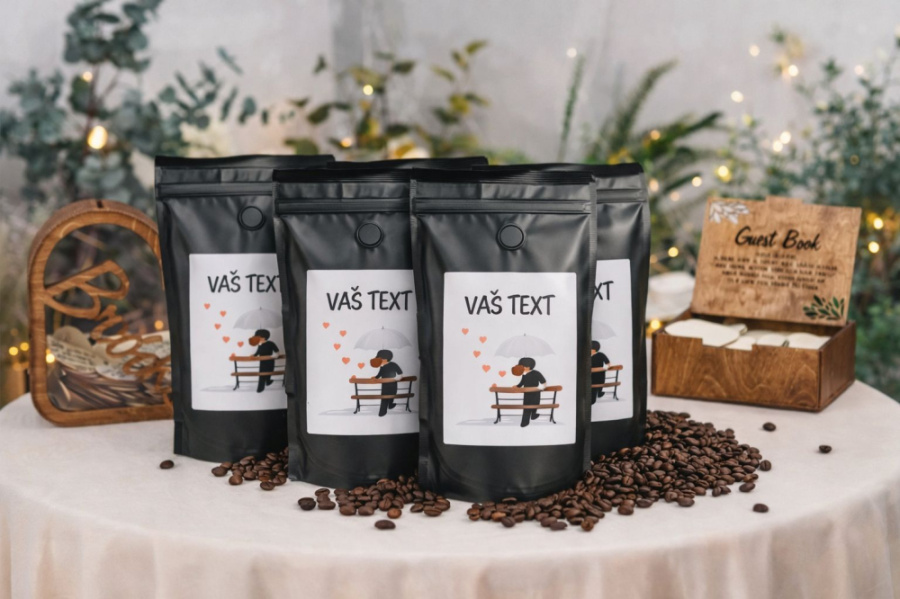Káva pre svadobných hostí - Unikátna svadobná káva s vlastným motívom a textom - menami a dátumom svadby. K dispozícii viacero druhov kávy, podrobný popis nájdete nižšie.